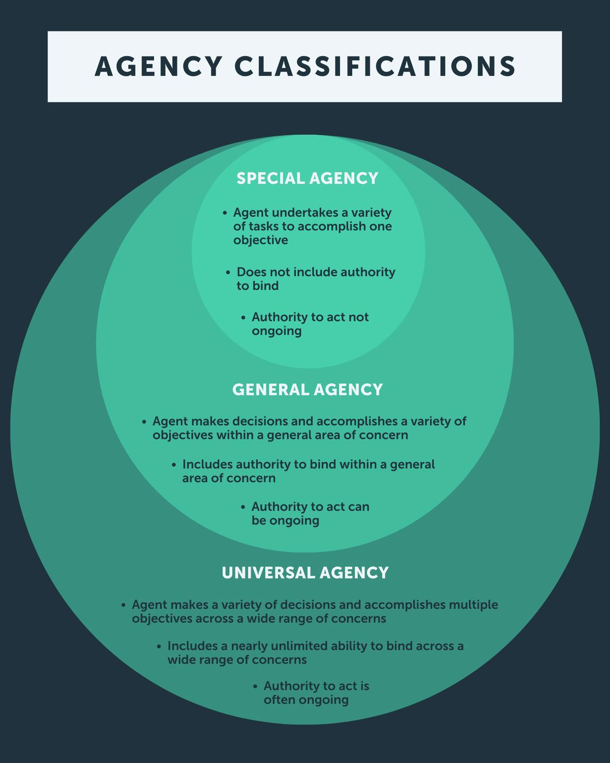 General agency enables an agent to take action for another person on an ongoing basis to achieve a variety of tasks within a specific area. In contrast to special agency, general agency isn't limited to a single event. Additionally, as a general agent, you can be granted the authority to bind within the specific area you are managing. An example of a general agent would be a property manager who acts on behalf of clients on an ongoing basis. Another example would be a client that wants you to handle multiple real estate transactions on their behalf. General agency can be granted by a general power of attorney.