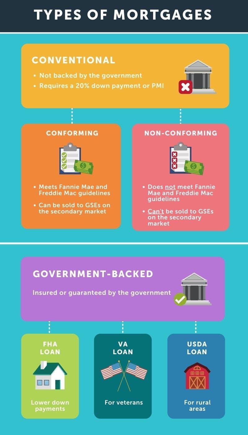 Conventional Loans: A conventional loan is not backed by a government agency. While they require mortgage insurance if the down payment is less than 20%, their interest rates are usually competitive.